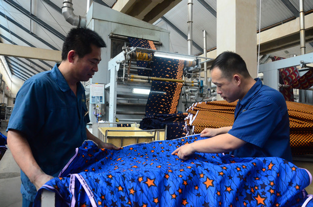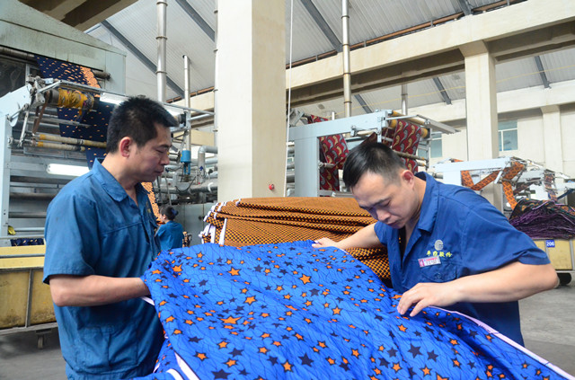 圖為公司花布車間蒸化機兩名員工在查看下機產品質量。