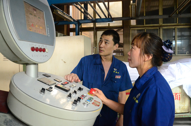 圖為面一車間拉幅預(yù)縮精益生產(chǎn)承包小組副組長孫新強(左)、預(yù)縮機機長郭芳,在預(yù)縮機操作臺前準備開車生產(chǎn)的情形。