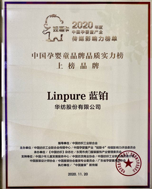 導(dǎo)讀:日前,公司Linpure藍(lán)鉑品牌既獲“娃斯卡”2019年度中國孕嬰童品牌暖心實(shí)力榜后,再獲中國孕嬰童產(chǎn)業(yè)“娃斯卡”傳媒影響力評選委員會頒發(fā)的2020年度中國孕嬰童品牌品質(zhì)實(shí)力大獎。