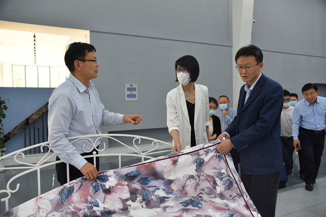 調(diào)研組一行先后到公司智云中心、檢測中心、綜合辦公區(qū)、服裝面料展廳、花布展廳、家紡展廳、創(chuàng)意設(shè)計中心、工程技術(shù)研究院、花布車間生產(chǎn)現(xiàn)場等實地調(diào)研,詳細(xì)了解了企業(yè)運行、市場營銷、科技創(chuàng)新、戰(zhàn)略規(guī)劃等情況,詢問企業(yè)發(fā)展過程中遇到的問題和困難,并聽取了公司董事長盛守祥對公司總體生產(chǎn)經(jīng)營情況的匯報。調(diào)研組對公司多年來的發(fā)展成績給予了充分肯定,并表示華紡公司多年來深耕紡織印染領(lǐng)域,不斷做大做強、是一家高質(zhì)量發(fā)展、成長性良好的企業(yè);同時,企業(yè)在發(fā)展的過程中積極履行社會責(zé)任,體現(xiàn)了企業(yè)的社會擔(dān)當(dāng)。