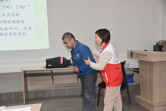 培訓(xùn)課上,王燕老師首先介紹了紅十字運(yùn)動(dòng)的基本知識(shí),隨后重點(diǎn)針對(duì)日常生活中較為常見的意外事故,向在場員工詳細(xì)講解,并演示了創(chuàng)傷救護(hù)、氣道異物梗阻急救、海姆立克急救法、心肺復(fù)蘇及包扎固定等急救技能和相關(guān)知識(shí)。