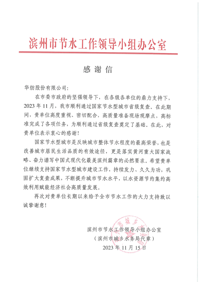 近日,濱州市節(jié)水工作領(lǐng)導小組辦公室向公司發(fā)來一封感謝信,信中指出:“2023 年11月,我市順利通過國家節(jié)水型城市省級復查。在此期間,貴單位高度重視、密切配合,高質(zhì)量準備現(xiàn)場觀摩點,高標準完成了各項任務(wù),為順利通過省級復查奠定了基礎(chǔ)。”