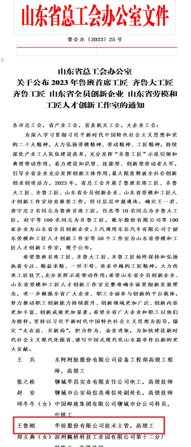 導讀:近日,省總工會下發(fā)通知,公布了多項獲獎名單,其中,公司面料車間技術主管、高級工王魯剛榮獲第六屆“齊魯工匠”稱號。