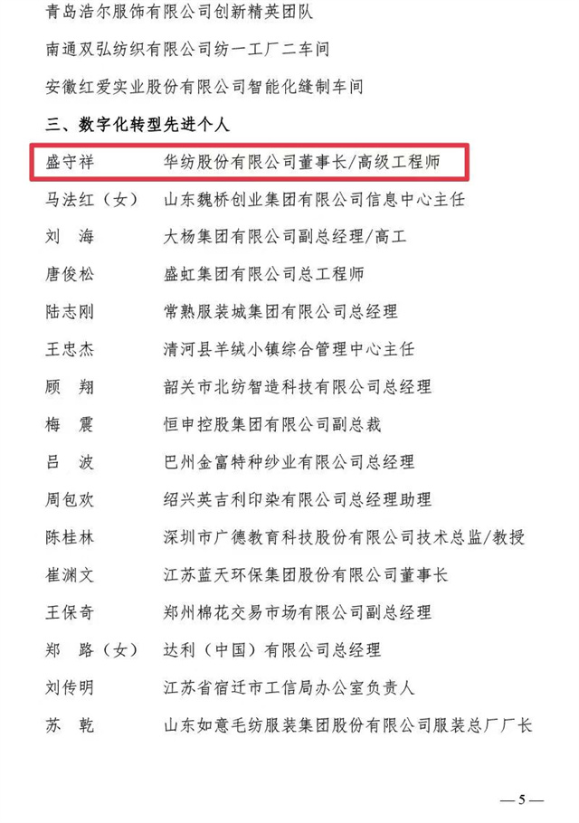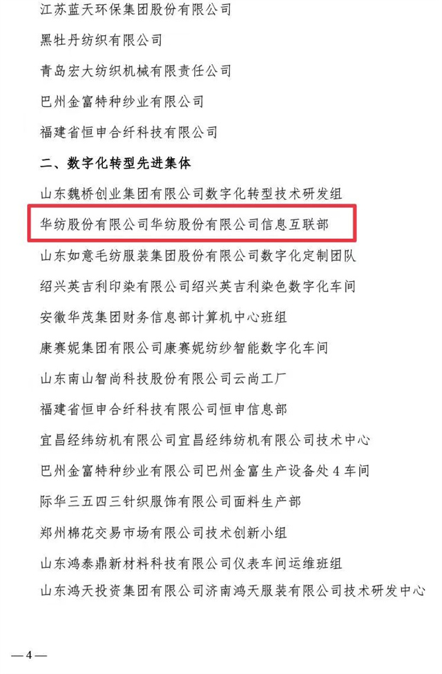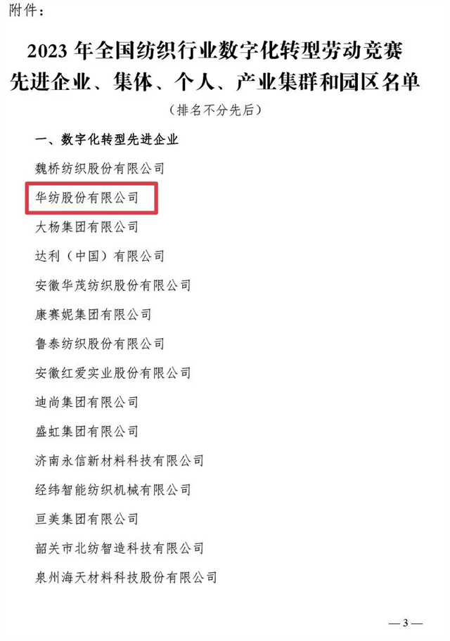 近日,中國(guó)紡織工業(yè)聯(lián)合會(huì)、中國(guó)財(cái)貿(mào)輕紡煙草工會(huì)全國(guó)委員會(huì)聯(lián)合發(fā)布了《關(guān)于2023年全國(guó)紡織行業(yè)數(shù)字化轉(zhuǎn)型勞動(dòng)競(jìng)賽結(jié)果的通報(bào)》,公司憑借2023年在數(shù)字化轉(zhuǎn)型方面的不斷探索與創(chuàng)新被評(píng)為“數(shù)字化轉(zhuǎn)型先進(jìn)企業(yè)”,公司信息互聯(lián)部被評(píng)為“數(shù)字化轉(zhuǎn)型先進(jìn)集體”,公司黨委書記、董事長(zhǎng)盛守祥先生被評(píng)為“數(shù)字化轉(zhuǎn)型先進(jìn)個(gè)人”。