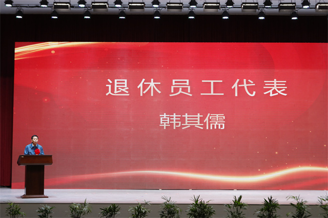 盛守祥為退休員工代表頒發(fā)榮譽證書,退休員工韓其儒代表80位退休同志做表態(tài)發(fā)言。