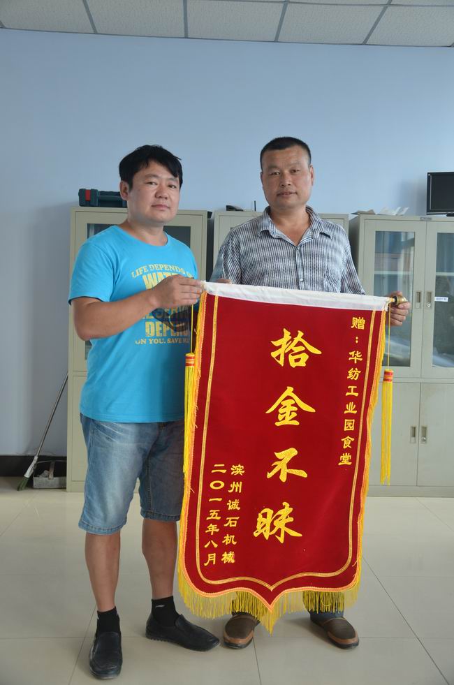 前不久,在公司科技產(chǎn)業(yè)園區(qū)食堂工作的陳春青收到了濱州誠石機(jī)械工作人員送來的錦旗,在對其拾金不昧表示感謝的同時,也表達(dá)了對陳春青的敬意。