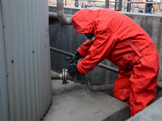 兩名穿戴防護(hù)裝備的人員關(guān)閉了相關(guān)的氨水罐、氨水泵閥門,并安排人員迅速設(shè)立警戒線,禁止無關(guān)的人員及車輛進(jìn)入。查看氨水罐圍堰是否有泄漏點(diǎn),用鐵锨鏟土進(jìn)行進(jìn)行封堵,防止污染物排出,造成環(huán)境污染。同時(shí)對(duì)已進(jìn)入排水溝的氨水用大量的稀釋水進(jìn)行稀釋,使污染物達(dá)到外排條件,各閥門關(guān)閉后泄露得到控制。整個(gè)過程緊張有序。