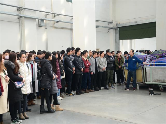 2月22日,濱州學院藝術學院黨總支副書記牛愛之、學生科科長秦玉國及240余名師生來到公司參觀交流,公司人力資源部、職工學院、團委等負責人,帶領師生們一行參觀了公司科技產(chǎn)業(yè)園的花二車間、制版中心、家紡成品車間等,并著重介紹了公司的發(fā)展狀況和前景。參觀結束后,同學們紛紛表示對公司整潔的工作環(huán)境、智能化的生產(chǎn)現(xiàn)場印象深刻。帶隊老師表示,華紡的發(fā)展令人鼓舞,希望回校后組織有就業(yè)意向的學生來公司實習、就業(yè)。