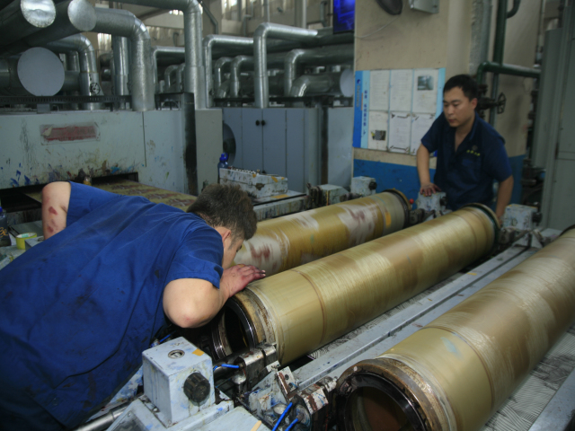 花一車間后處理技術(shù)員張延軍(圖右)與軋光機(jī)機(jī)長吳秀祝在交流生產(chǎn)情況。他倆表示,每一米優(yōu)質(zhì)產(chǎn)品都是靠專注認(rèn)真干出來的。