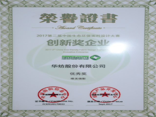 在參評的設計作品方面,由公司員工席亞偉設計開發(fā)的“風飄絮”、孟鑫設計的“Strange Camouflage”產(chǎn)品,榮獲“2018/2019秋冬中國流行面料入圍評審優(yōu)秀獎”;孟鑫設計的“唯美倩影”作品,榮獲“2017第二屆中國生態(tài)環(huán)保面料設計大賽優(yōu)秀獎”。