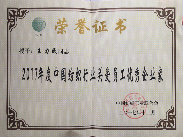 導(dǎo)讀:日前,中國(guó)紡織工業(yè)聯(lián)合會(huì)2017年人才工作大會(huì)在濟(jì)南召開(kāi),公司榮獲“2017年度中國(guó)紡織行業(yè)人才成長(zhǎng)最佳企業(yè)”稱號(hào);王力民榮獲“2017年度中國(guó)紡織行業(yè)關(guān)愛(ài)員工優(yōu)秀企業(yè)家”稱號(hào)。