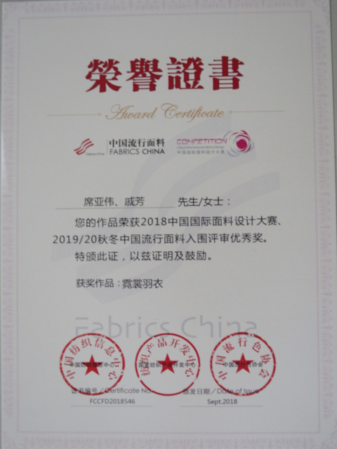 導(dǎo)讀:日前,公司在2018年中國國際面料設(shè)計(jì)大賽、第40屆(2019/20秋冬)中國流行面料入圍評(píng)審中再獲佳績(jī),被授予“2019/20秋冬流行面料入圍企業(yè)”稱號(hào),由席亞偉、戚芳設(shè)計(jì)的“霓裳羽衣”面